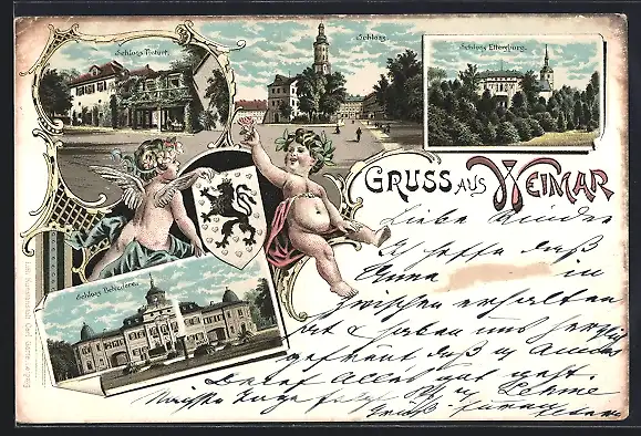 Lithographie Weimar / Thüringen, Schloss Tiefurt, Schloss Ettersburg, Schloss Belvedère