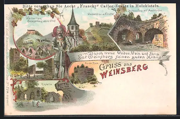 Lithographie Weinsberg, Weibertreu, Kirche, Burgverliess mit Aeolsharfen