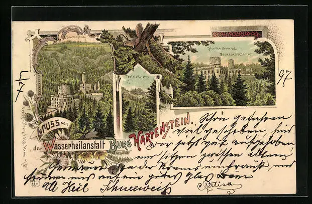 Lithographie Weinzierl, Wasserheilanstalt Burg Hartenstein v. d. Schwedenschanze, Teufelskirche