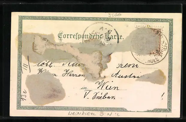 Personenbezogene Daten auf der Rückseite der Karte wurden durch blauen Textmarker unkenntlich gemacht. Die blauen Stellen sind auf die Vorderseite durchgeweicht und wirken sich negativ auf das Postkartenfoto aus