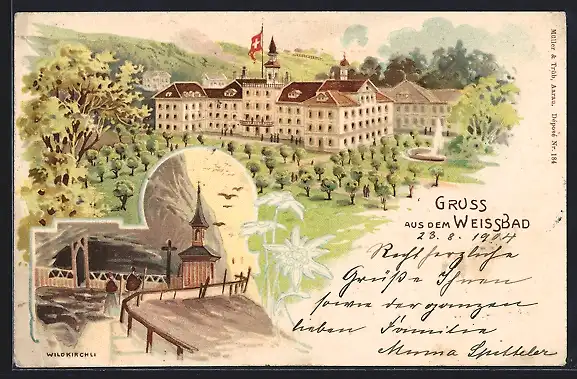 Lithographie Weissbad, Wildkirchli, Ortsansicht, Flagge