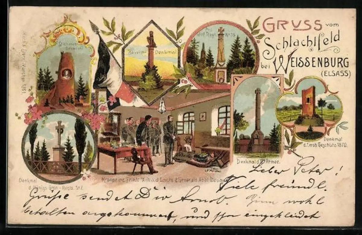 Lithographie Weissenburg / Elsass, Schlachtfeld, Bayern-Denkmal, Denkmal d. III. Armee, Stichaner Denkmal