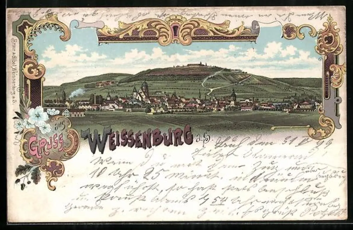 Lithographie Weissenburg a. S., Ortsansicht vom Feld aus gegen die Anhöhen