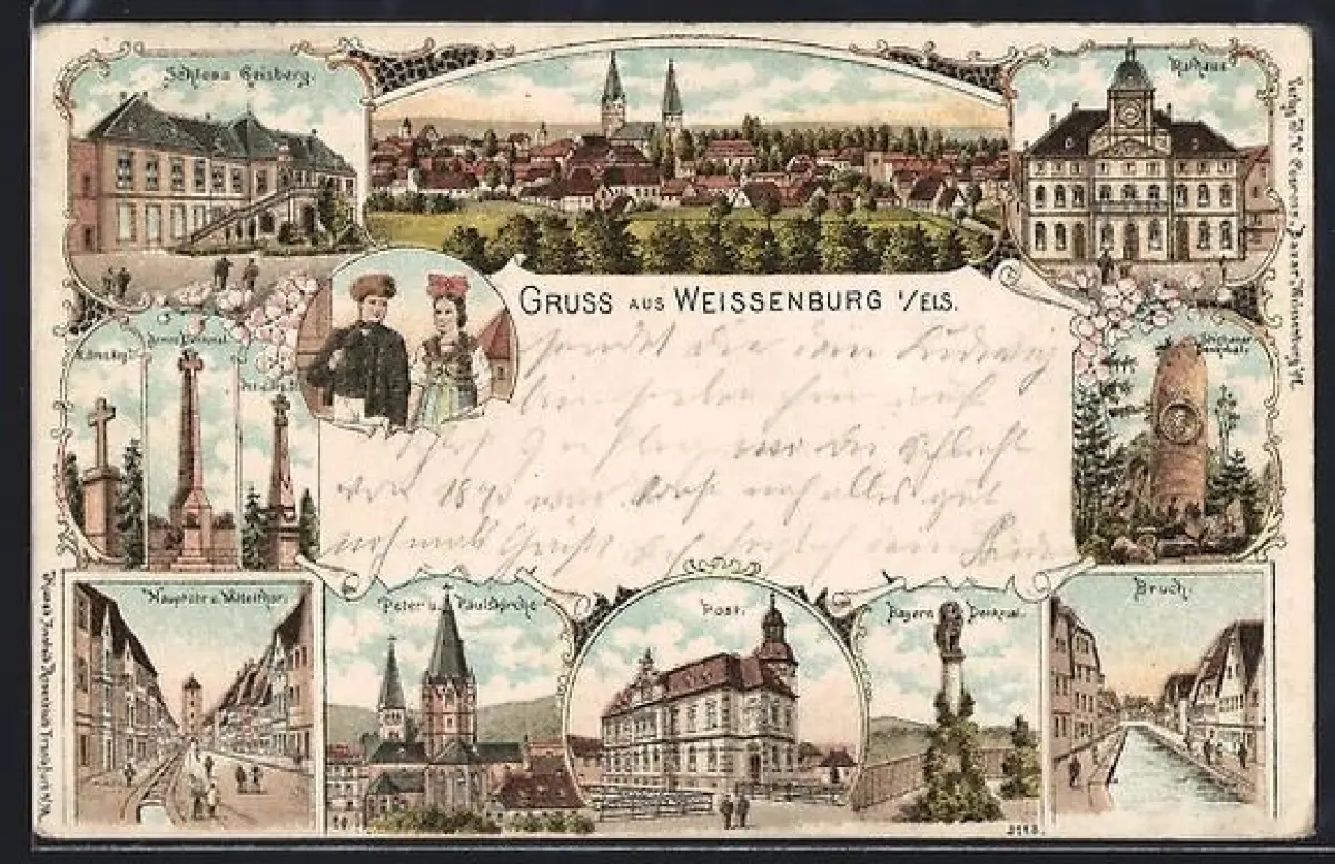 Lithographie Weissenburg i. Els., Schloss Geisberg, ruch, post, Hauptstrasse