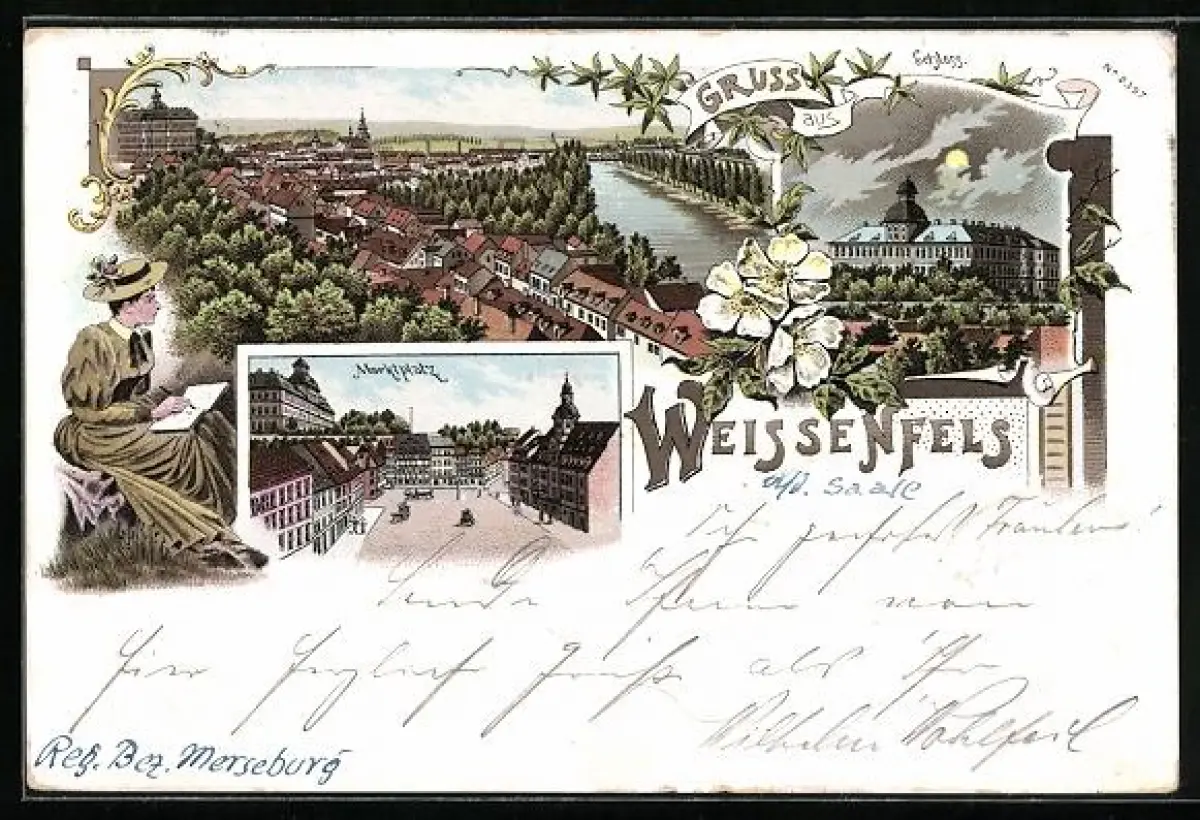 Lithographie Weissenfels, Marktplatz, Schloss, Ortsansicht mit Flusspartie