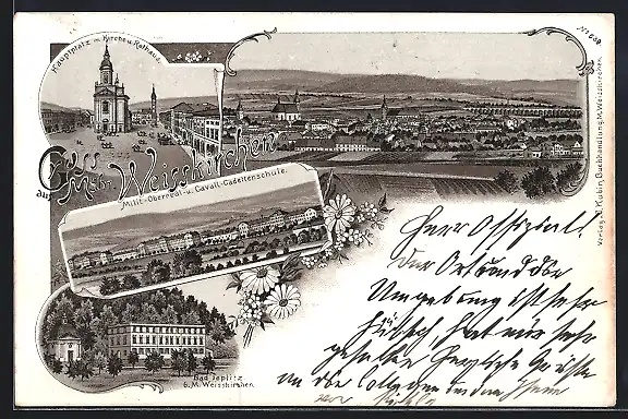 Lithographie Weisskirchen, Totalansicht, Hauptplatz m. Kirche und Rathaus, Milit.- Oberreal- u. Cavall. Cadettenschule