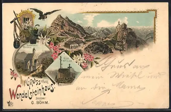 Lithographie Wendelsteinhaus, Panorama mit Gipfel & Wendelsteinkirchlein