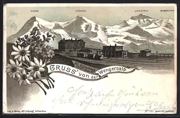 Lithographie Wengernalp, Kl. Scheidegg mit Eiger, Mönch und Jungfrau