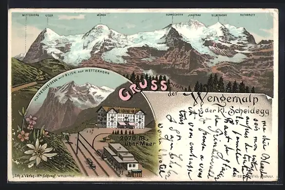 Lithographie Wengernalp, Kleine Scheidegg mit Blick auf Wetterhorn, Zug, Gebirgspanorama mit Mönch u. Jungfrau