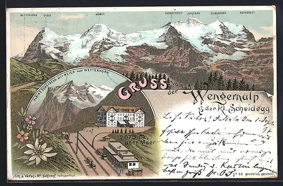 Lithographie Wengernalp, Kleine Scheidegg mit Blick auf Wetterhorn, Zug, Gebirgspanorama mit Mönch u. Jungfrau