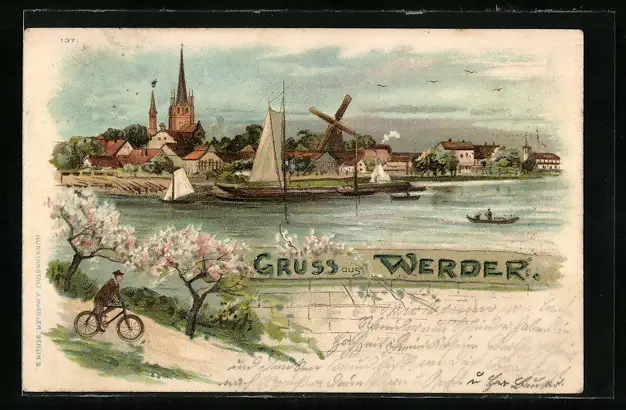 Lithographie Werder, Panorama mit Mühle und Kirche, Radfahrer im Frühling