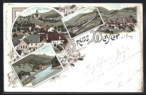 Lithographie Weyer, Bahnhof, Enns, Pfarrkirche, Blick auf den Ort