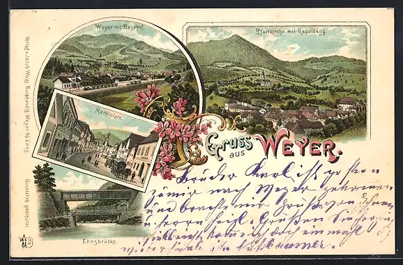 Lithographie Weyer, Ennsbrücke, Marktplatz, Ortsansicht mit Bahnhof, Pfarrkirche mit Rapoldegg