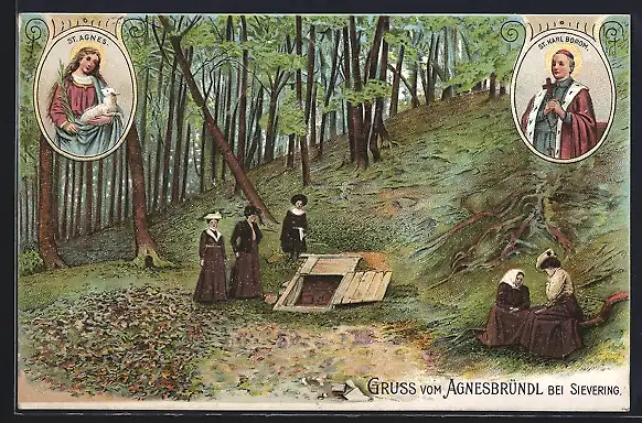 Lithographie Wien, Agnesbründl am Hermannskogel, St. Agnes, St. Karl Borom, Geheimeingang im Wald