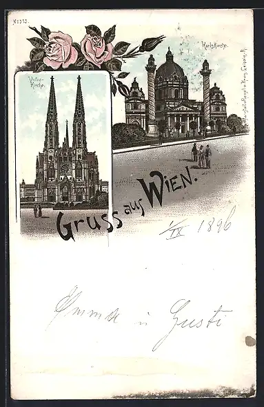 Lithographie Wien, An der Votiv-Kirche und der Karls Kirche