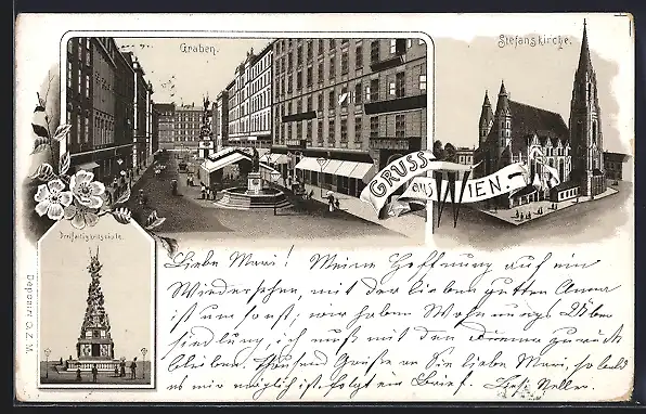 Lithographie Wien, Graben mit Brunnen, Stefanskirche, Dreifaltigkeitssäule