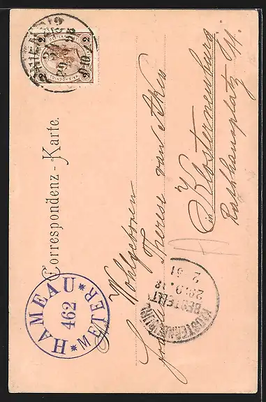Personenbezogene Daten auf der Rückseite der Karte wurden durch blauen Textmarker unkenntlich gemacht. Die blauen Stellen sind auf die Vorderseite durchgeweicht und wirken sich negativ auf das Postkartenfoto aus