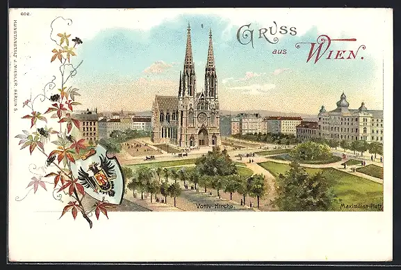 Lithographie Wien IX, Votiv-Kirche mit Wappen