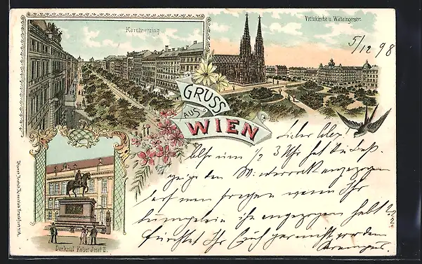 Lithographie Wien, Kärntnerring, Votivkirche u. Währingerstrasse, Denkmal Kaiser Josef II.