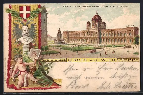 Lithographie Wien, Kaiser Franz Josef I. von Österreich, Maria Theresia-Denkmal und K.K.Museen, Portrait d.Kaisers