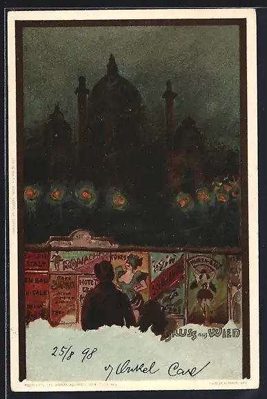 Lithographie Wien, Karlskirche bei Nacht mit bunter Plakatwand
