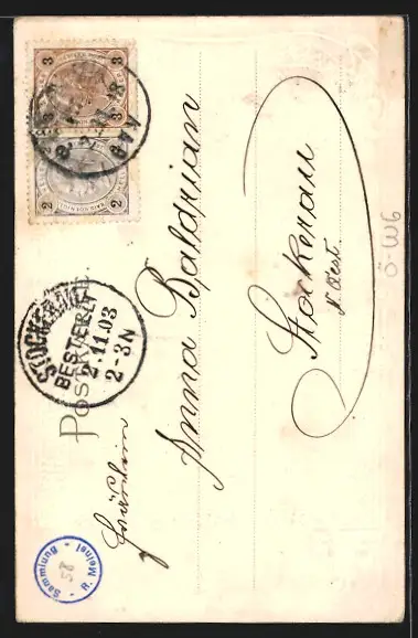 Personenbezogene Daten auf der Rückseite der Karte wurden durch blauen Textmarker unkenntlich gemacht. Die blauen Stellen sind auf die Vorderseite durchgeweicht und wirken sich negativ auf das Postkartenfoto aus