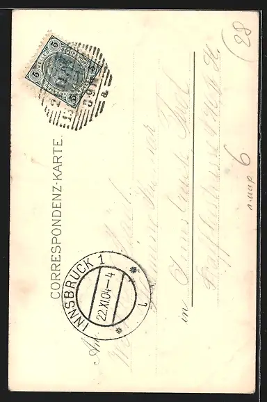 Personenbezogene Daten auf der Rückseite der Karte wurden durch blauen Textmarker unkenntlich gemacht. Die blauen Stellen sind auf die Vorderseite durchgeweicht und wirken sich negativ auf das Postkartenfoto aus