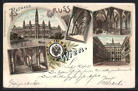 Lithographie Wien, Rathaus, Arkaden im Hof, Hofansicht und Wappen