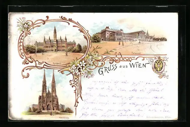 Lithographie Wien, Rathaus, Votivkirche, Parlament