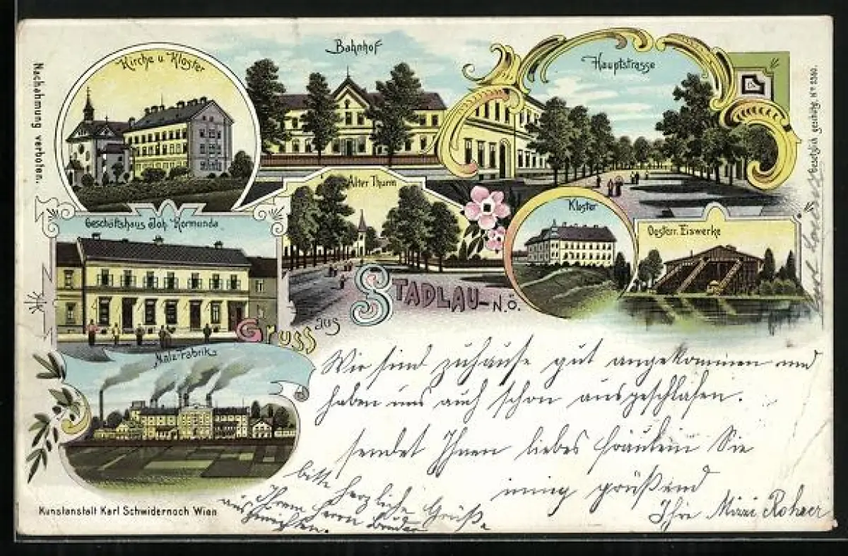 Lithographie Wien-Stadlau, Geschäftshaus Joh. Rormuna, Malz-Fabrik, Oesterr. Eiswerke