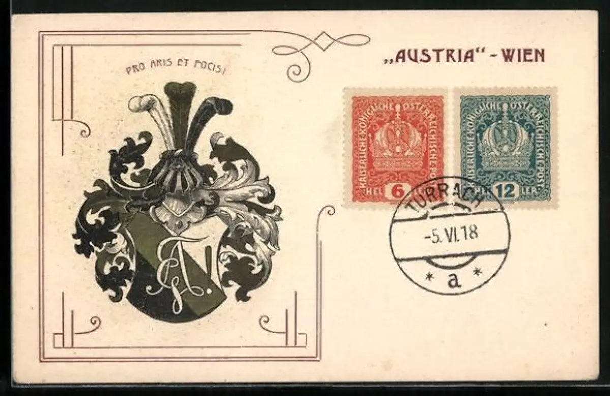 Lithographie Wien, Studentenwappen Austria mit Helm, Pros Aris Et Focisi
