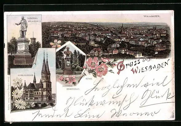 Lithographie Wiesbaden, Denkmal Wilhelm I., Ringkirche, Denkmal Bodenstedt, Totalansicht
