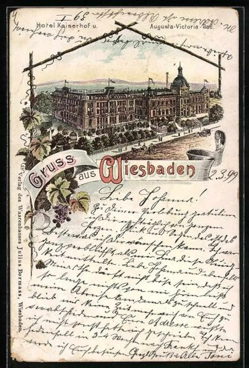 Lithographie Wiesbaden, Hotel Kaiserhof und Augusta-Victoria-Bad aus der Vogelschau