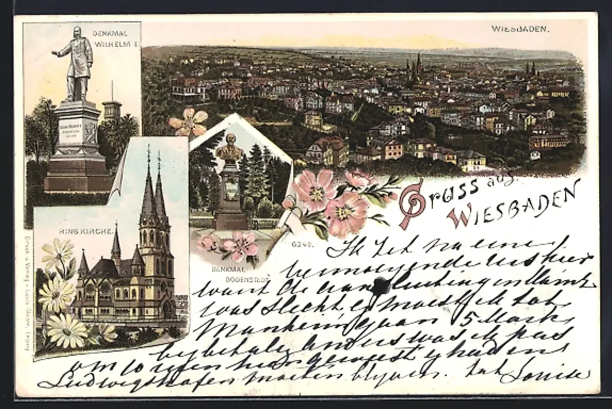 Lithographie Wiesbaden, Ring Kirche, Denkmal Kaiser Wilhelm I., Denkmal Bodenstedt, Gesamtansicht