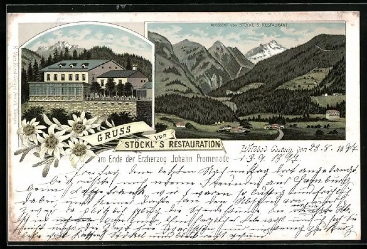 Lithographie Wildbad Gastein, Stöckl`s Restaurant am Ende der Erzherzog Johann Promenade