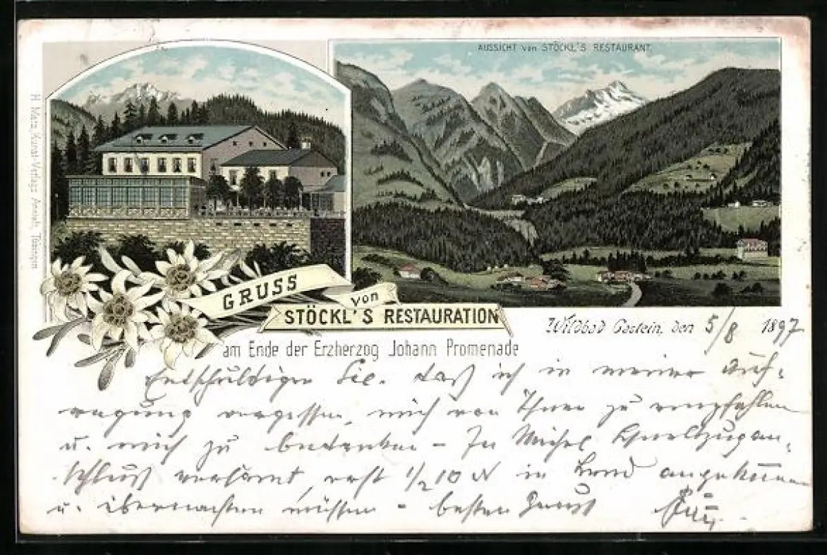 Lithographie Wildbad Gastein, Stöckl's Restauration, Aussicht von der Restauration auf gewaltiges Gebirgspanorama