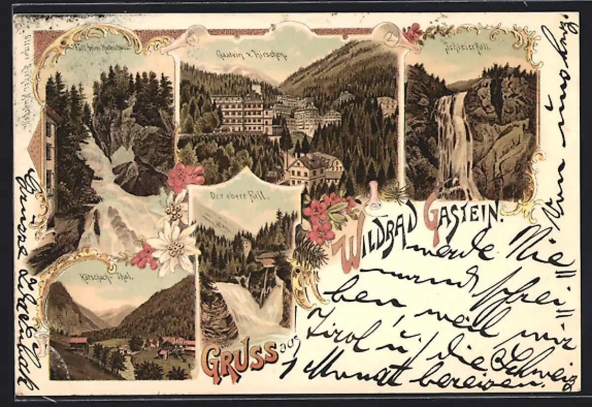 Lithographie Wildbad Gastein, Teilansicht vom Hotel Hirschen, Kötschach-Thal, Oberer Fall