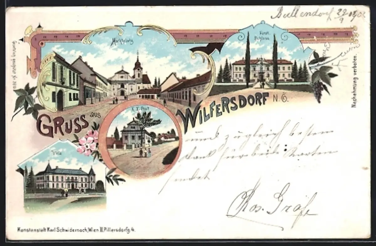 Lithographie Wilfersdorf /Weinviertel, Fürstliches Schloss, Marktplatz, Villa
