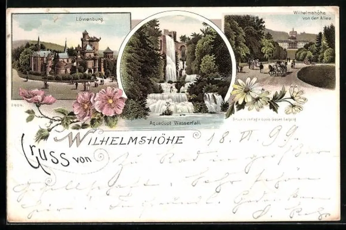 Lithographie Wilhelmshöhe, Löwenburg, Aquädukt Wasserfall, Wilhelmshöhe von der Allee