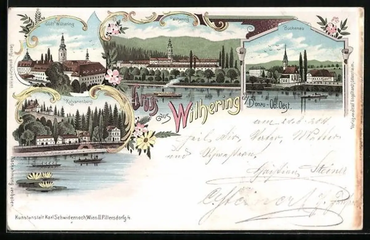 Lithographie Wilhering a. Donau, Stift, Kalvarienberg, Blick auf Buchenau