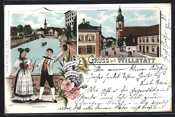 Lithographie Willstätt, Hauptstrasse, Paar in Tracht am der Flussbrücke