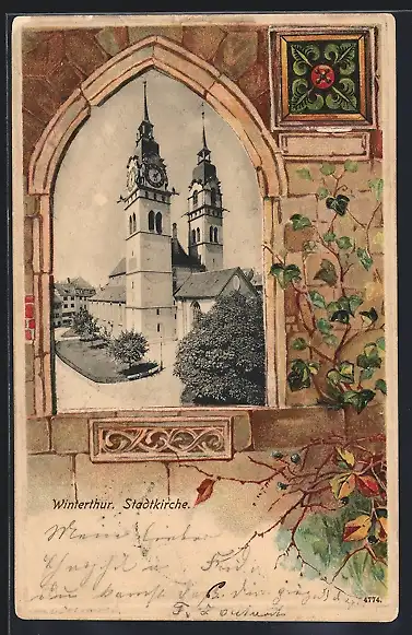 Lithographie Winterthur, Blick auf die Stadtkirche, Mauerfenster-Passepartout