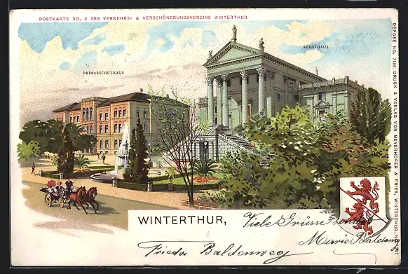 Lithographie Winterthur, Primarschulhaus nebst dem Stadthaus