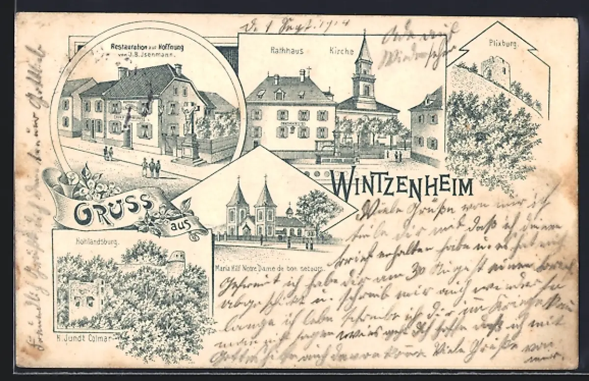Lithographie Wintzenheim, Restauration zur Hoffnung v. J. B. Isenmann, Rathaus, Kirche