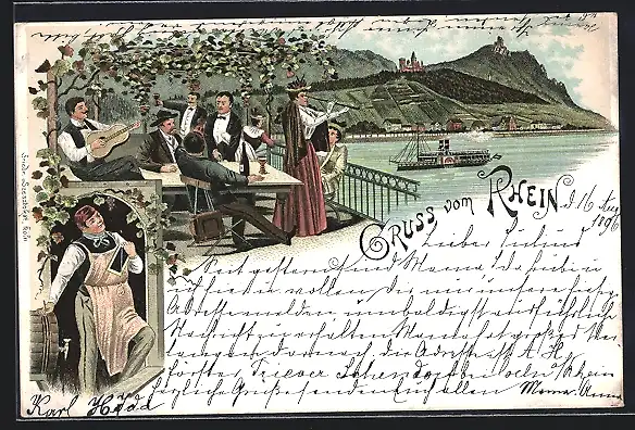 Lithographie Winzer an einem Weinfass, Weinberge am Rheinufer