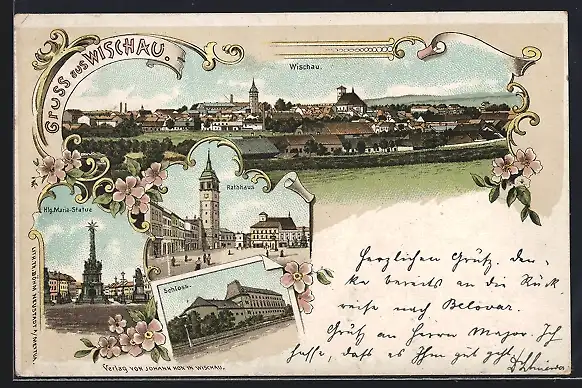 Lithographie Wischau / Vyskov, Rathaus, Hgl. Maria-Statue, Schloss