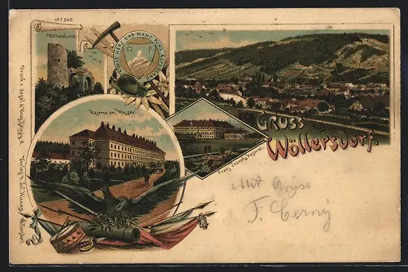 Lithographie Wöllersdorf, Franz Josephs Kaserne, Kaserne am Wasser, Höllenturm