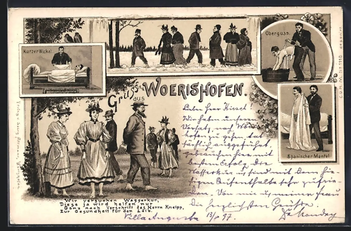 Lithographie Wörishofen, Kurzer Wickel, Oberguss, Spanischer Mantel, Wasserkur nach Kneipp