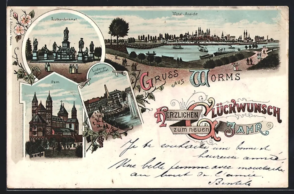 Lithographie Worms, Dom, Ludwigsdenkmal, Lutherdenkmal