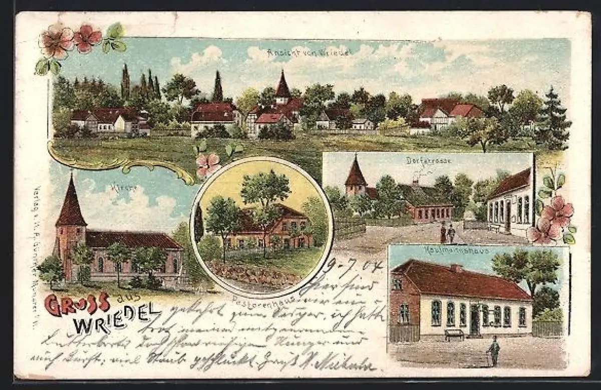 Lithographie Wriedel, Kaufmannshaus, Dorfstrasse, Pastorenhaus, Kirche und Ortsansicht